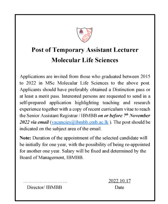 Vacancy Notices Institute Of Biochemistry Molecular Biology And Biotechnology